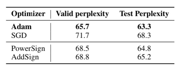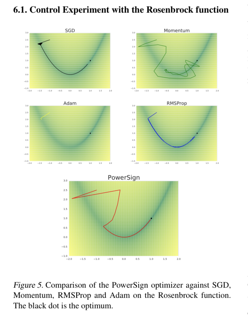 3. Rosenbrock Function test와 이미지넷 학습 등 여러 태스크에서 Adam을 뛰어넘는 성적을 보였으나, NMT(Neural Machine Translation) 에서는 Adam에게 진 것으로 보아 아주 제너럴하지는 않고 그럭저럭 제너럴하다고 볼 수 있을 것 같다. (그래서인지 Swish는 가끔 쓰이는데 여기서 찾은 optimizer는 쓰는 걸 못봤다)