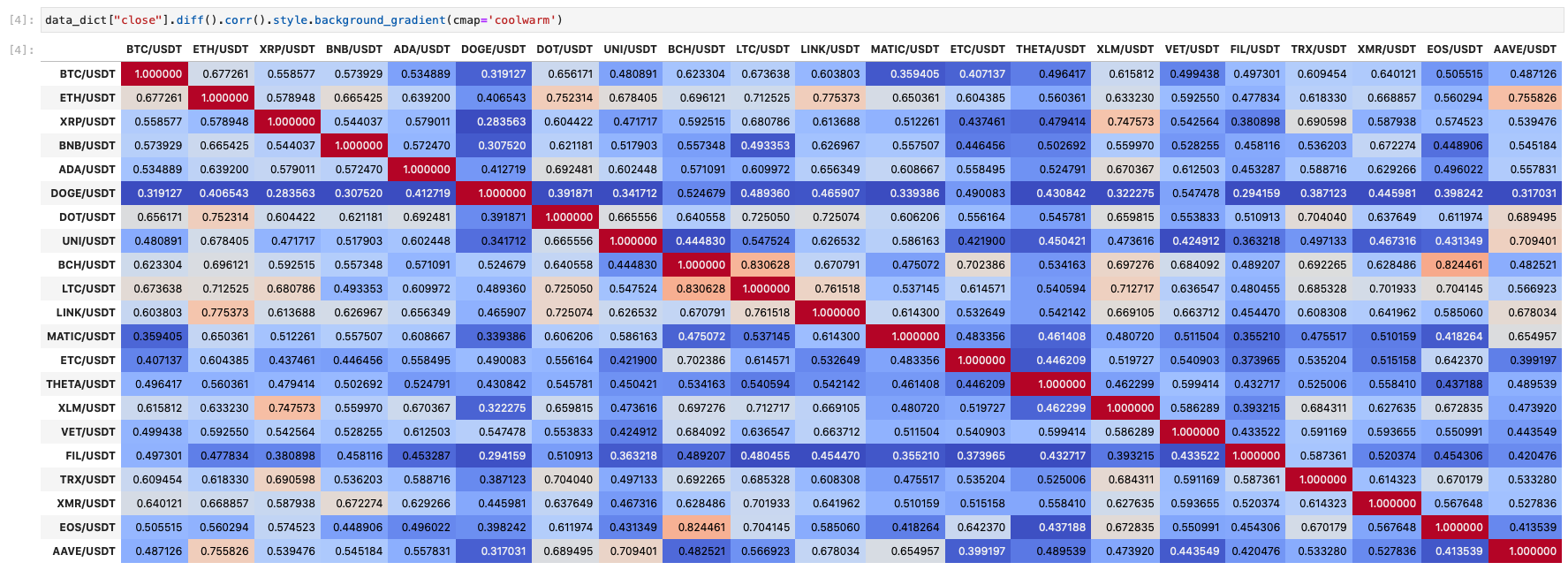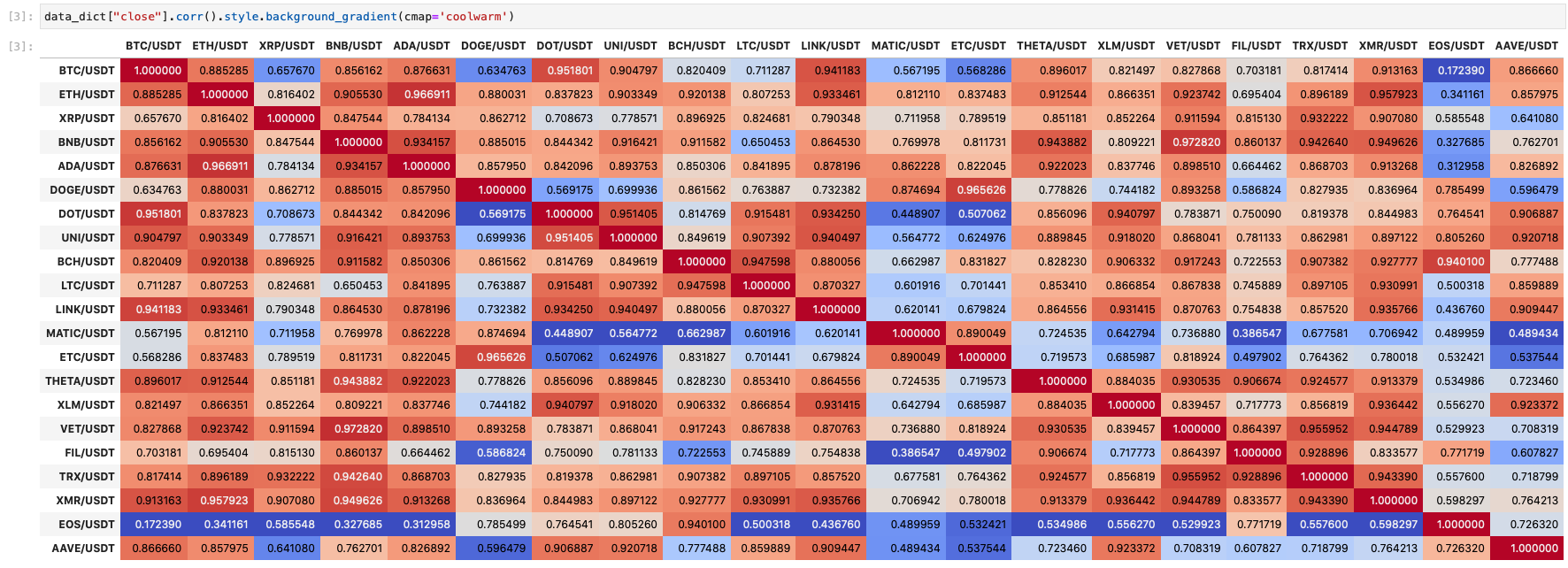 심심해서 가지고 있는 바이낸스 데이터로 메이저 코인들의 상관성을 구해 보았다.