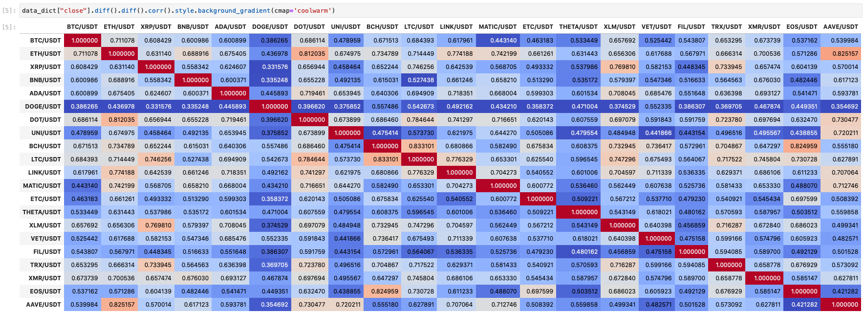 코인은 기본적으로 "확률적 추세가 있는 불안정 시계열" 이다. 그러므로 차분해 상관관계를 계산하면 더욱 명확한 그림이 나온다.