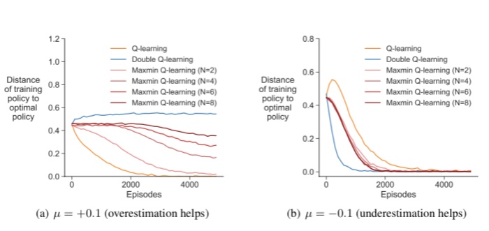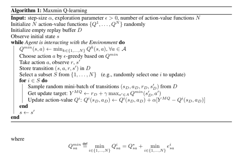 2. 이런 것을 보완하기 위해 double q-learning이 고안되기도 했지만 이것은 과도한 underestimation을 가져오기 때문에, 본 논문에서는 Q함수를 N개 사용하고 그중 가장 작은 것을 타겟으로 사용하는 maxmin q-learning을 제안한다.