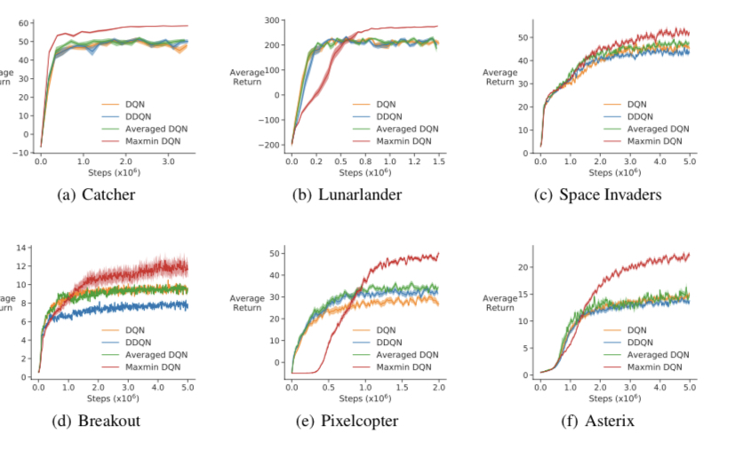 3. 이것을 DQN에 적용하게 되면 여러개의 타겟 큐함수를 만들어놓고 매스텝 랜덤하게 그중 하나만 업데이트에 사용하는 방식을 취하면 된다. 이 방법을 통해 overestimation을 줄여 에이전트의 최종 성능이 기존 방법론들에 비해 유의미하게 향상된 것을 볼 수 있다.