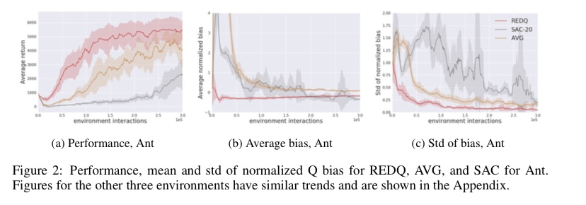 3. 그렇지만 SAC 같은 알고리즘은 UTD ratio를 너무 많이 쓰면 당연하게도 bias와 그 표준편차가 매우 커져 불안정하게 된다. 이것을 해결하기 위해 ensemble 방법론과 in-target minimization을 도입해 매우 안정적이면서 높은 성능의 학습이 가능하게 되었다.