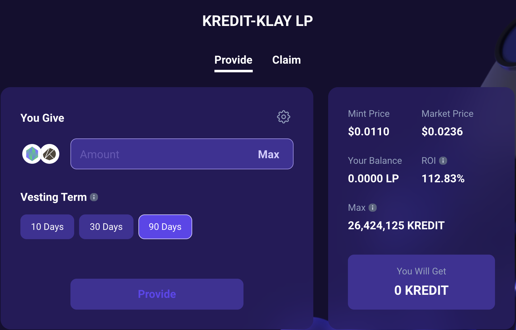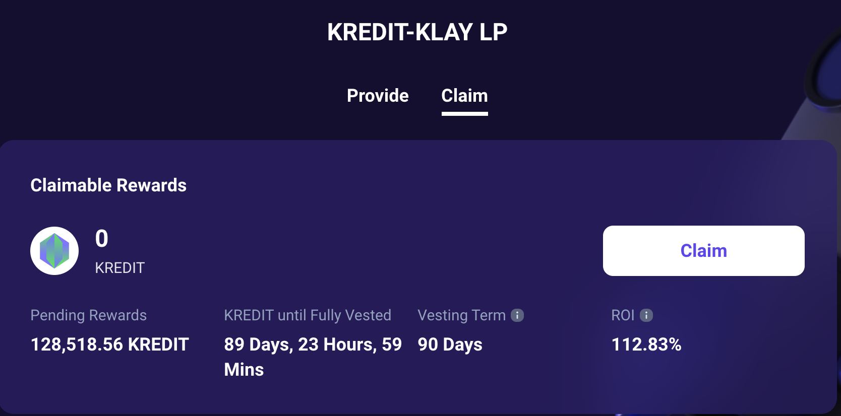 저렇게 하고 나면 이제 위에 krunchpad에서 LP수량 뜨는데 원하는 베스팅텀 넣고 예치하면 끝이다. 보상률 90일 하고 112%면 괜찮은 것같아서 가볍게 1000KLAY어치 LP 90일 베스팅 걸어두었다. 정찰병이고 나중에 클레이 증액해서 더 넣어 볼수도...?