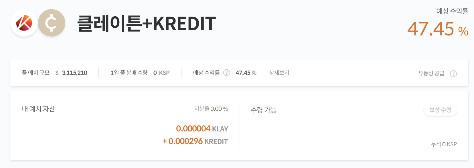 LP 토큰은 언제나 그랬듯이 KLAYSwap에서 합성해 오면 된다. 거래를 많이들 하는지 풀 수수료 분배만 47%에 달한다.