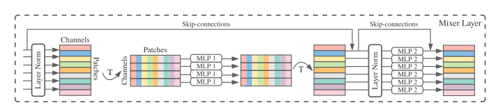 "MLP" Mixer이다. 뭔가 감이 오지 않는가? 맞다. 이것은 MLP만으로 만든 비전 신경망이다. 구현하기 편하고, 가볍고, 간단한 형태의 신경망이다. 이미지를 돌려서 자른 row 하나하나에 MLP를 입히고, 다시 돌리고, 다시 MLP 입히고, 하는 신경망이다. 여기서 각 층의 MLP는 딱 하나씩, 그러니까 CNN의 필터처럼 weight가 공유되는 형태이다. 이것은 MLP Mixer를 매우 가볍게 만들어 준다. 이 구조는 사진으로 한번만 보면 정말 직관적으로 잘 이해된다.