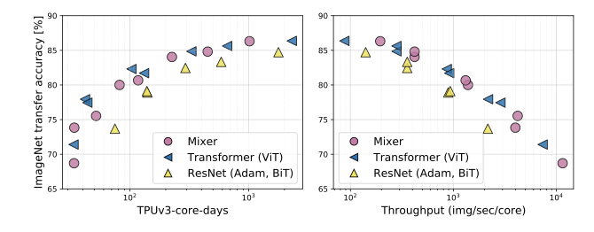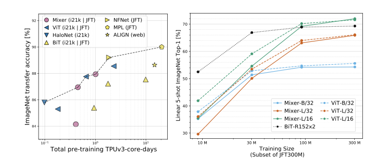 비전을 위한 신경망 아키텍쳐들은 본 글의 머릿말과 같이 데이터셋의 크기가 커지고, 컴퓨터 자원의 성능이 올라감에 따라 패러다임이 계속 바뀌어 왔다. 기존 휴리스틱, 머신러닝 기반 컴퓨터 비전부터, ResNet과 EfficientNet 같은 Convolutional Neural Network들, Vision Transformer(ViT), 그리고 오늘 소개하는 MLP Mixer까지, 참 빠르고 자주 변해온 것 같다. ViT까지의 발전 방향은, 더 크고, 더 복잡하고, 더 정확한 모델을 만드는 것이었다.