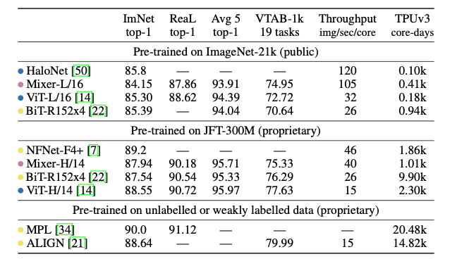 당연히 빠질 수 없는 ImageNet Accuracy. 사실 이 실험 결과에서 Accuracy가 그렇게 중요한 것은 아닌 것 같다. 결국 퍼포먼스 자체는 BiT-ResNet152x4보다는 좋지만, ViT보다 떨어졌다. (0.5% 정도) 사실 그래서 퍼포먼스 자체는 비슷하다. 그렇지만 MLP Mixer는 벤치마크로 사용된 신경망보다 훨씬 간단하고, 학습시간이 덜 들었다. BiT 대비 거의 2배, ViT 대비 2.5배 정도 향상되었다.